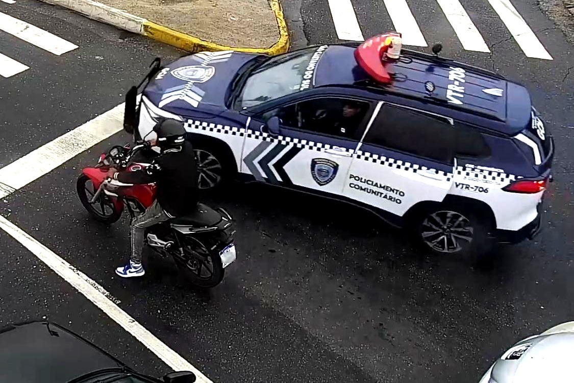 O caso ocorreu por volta das 16h, quando agentes do CGE identificaram a entrada de uma Honda CG, cadastrada no sistema de inteligência como tendo sido utilizada em roubos. Ao perceber que viaturas da Rotam (Rondas Táticas com Apoio de Motocicletas) se aproximaram, o condutor tentou fugir, acabou batendo na viatura de apoio da ROMU (Rondas Ostensivas Municipais) e indo ao chão. O homem, o simulacro de arma de fogo e a motocicleta foram encaminhados à Delegacia Sede.