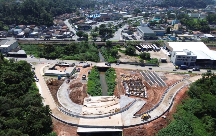 As obras do Viaduto Estaiado de Ribeirão Pires seguem em ritmo acelerado. Equipes trabalham na etapa final de implantação das alças de acesso do novo equipamento viário, que ligará Centro e Centro Alto. A próxima fase do projeto prevê o início da construção das vigas e fundação da ponte estaiada.