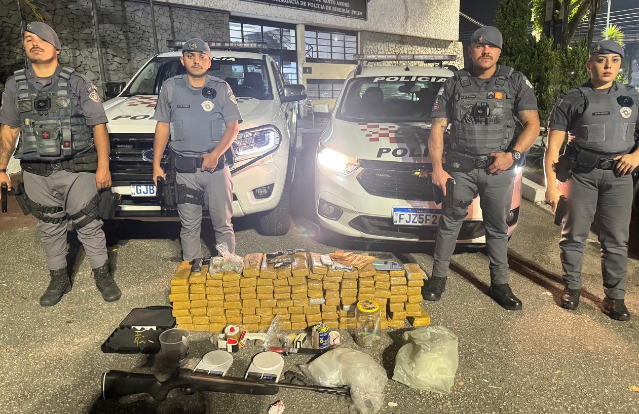O caso foi registrado na Delegacia de Ribeirão Pires como posse ou porte ilegal de arma de fogo de uso restrito, tráfico de drogas e disparo de arma de fogo.