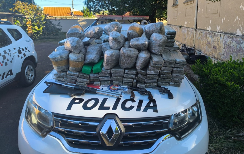 A dupla foi abordada, e os agentes realizaram uma vistoria no local. Em seguida, localizaram diversas bolsas com 178 tijolos de maconha, que totalizaram 144 quilos da droga. Além disso, foram encontrados três revólveres e uma espingarda.