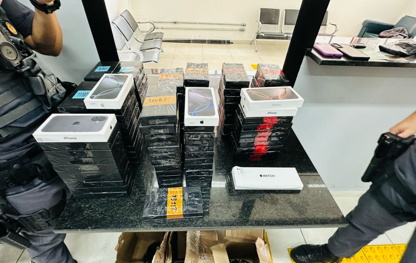 Os funcionários do local afirmaram que não conheciam o homem, então ele foi abordado. No carro em que ele estava, foram encontrados 122 celulares de alto valor e um smartwatch sem nota fiscal.