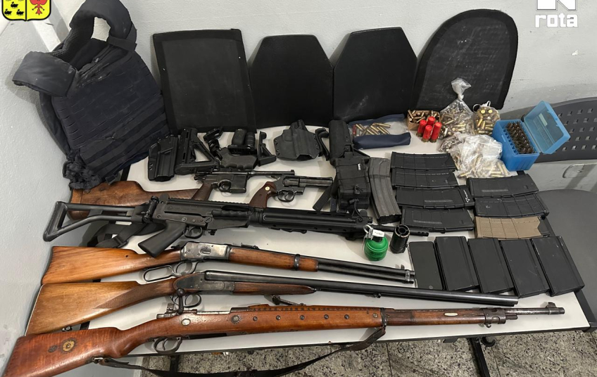 No imóvel, os policiais apreenderam um fuzil calibre 762, um revólver 357, duas carabinas calibre 12 e 38 e uma pistola 9 mm, além das munições, coletes balísticos, uma granada e três papelotes de cocaína. Os objetos foram encaminhados à perícia.