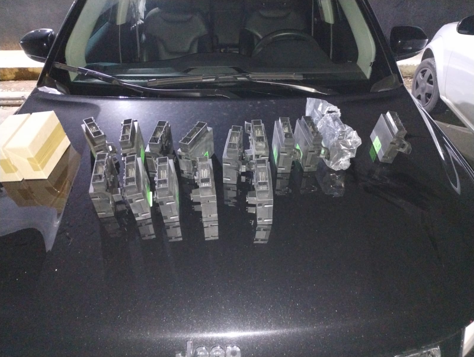 Ao chegarem ao local, os policiais visualizaram dois veículos abandonados. Durante a vistoria, foi constatado que o vidro traseiro de um dos veículos estava quebrado e, dentro do outro, foram encontrados 17 módulos automotivos, equipamentos utilizados para dar partida em veículos de diferentes modelos, porém esse não possuía registro de furto, sendo suspeito de ser o veículo de apoio dos criminosos.