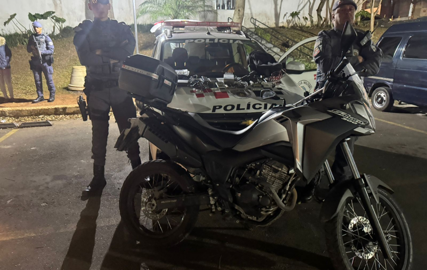 Também foram apreendidos um bloqueador de sinais de rastreador, seis celulares, um jogo de chaves de ferramentas, 27 notas fiscais de mercadorias de uma distribuidora atacadista, uma trava, três chaves de veículos, além de uma placa pertencente a outra motocicleta.