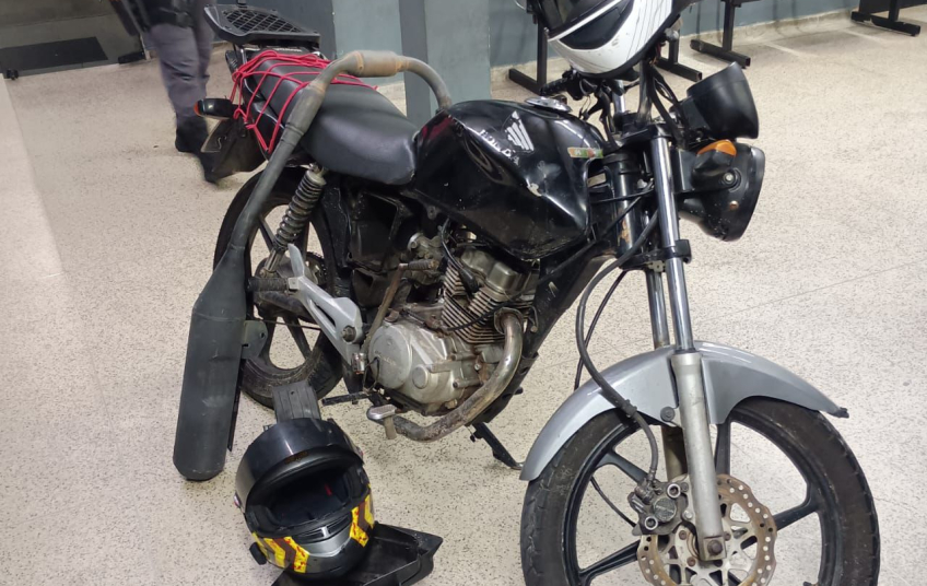 Com a autorização do morador, os policiais entraram na residência e localizaram uma motocicleta escondida atrás do sofá, coberta por panos, com o número do chassi suprimido e sem retrovisores. No local também foram encontrados um simulacro de arma de fogo e uma mochila contendo ferramentas e uma chave mixa.