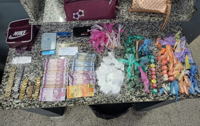 Realizada a busca pessoal, foi localizada com o averiguado uma outra bolsa contendo drogas, dinheiro e documentos pessoais, e na bolsa arremessada, diversos tipos de entorpecentes; maconha, crack e cocaína, dinheiro e moedas, totalizando: 130 porções de cocaína, 70 porções de crack, 70 porções de maconha e o valor de R$ 150,50 (cento e cinquenta reais e cinquenta centavos)