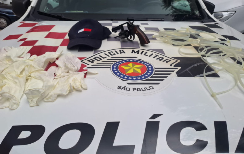 Com um dos abordados foi localizada uma mochila contendo um Revólver Calibre 38, numeração raspada e diversos apetrechos utilizados para roubo e furto de residências, tais como braçadeira de nylon, luvas e outras ferramentas