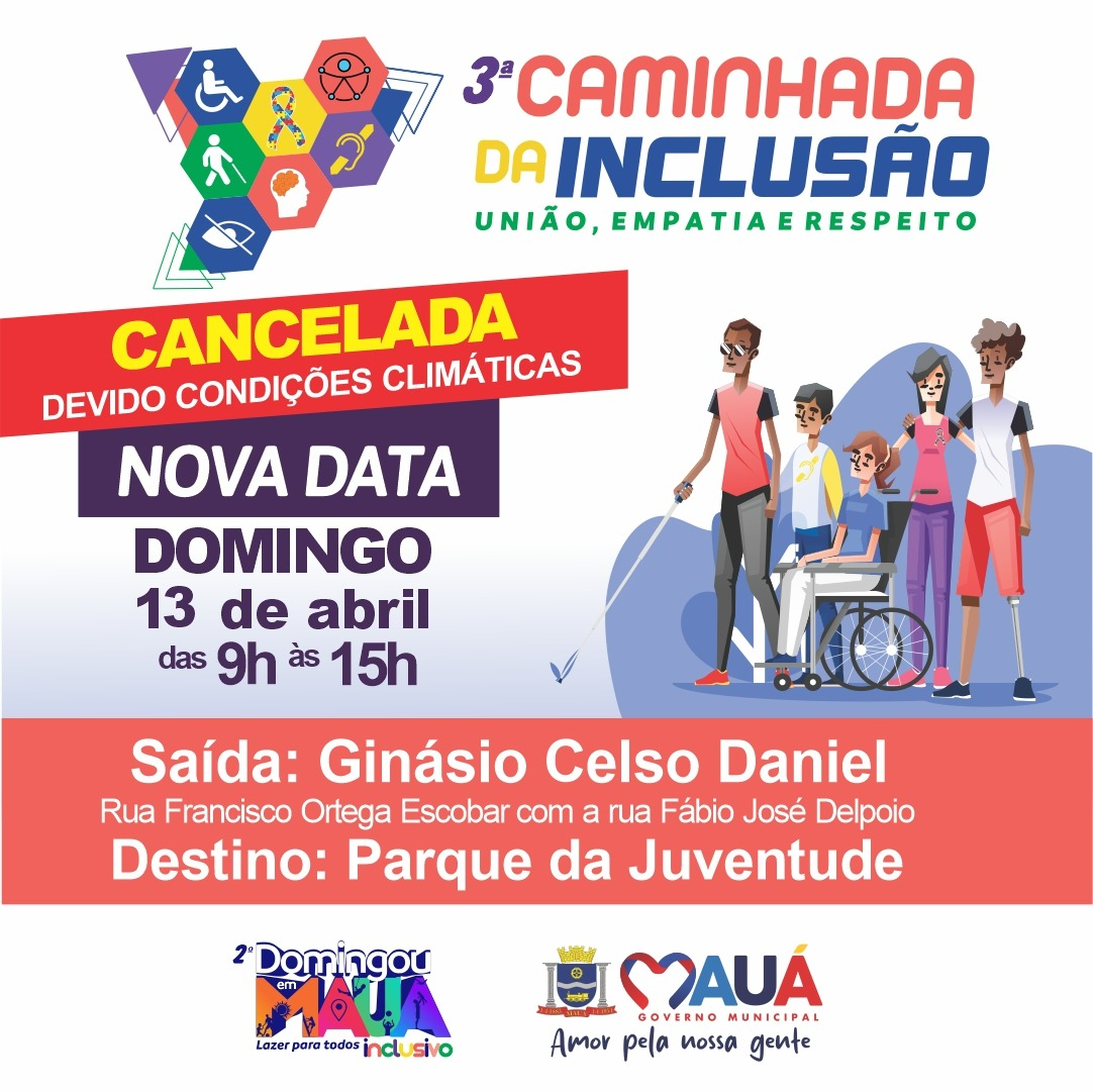 Em razão dos alertas emitidos pela Defesa Civil, sobre a previsão de chuvas fortes para o final de semana, por precaução, a Prefeitura de Mauá decidiu adiar a realização da 3ª Caminhada da Inclusão A ação, que visa celebrar o Dia Mundial de Conscientização sobre o Transtorno do Espectro Autista (TEA), que seria neste domingo (06/04), ocorrerá no próximo (13/04).