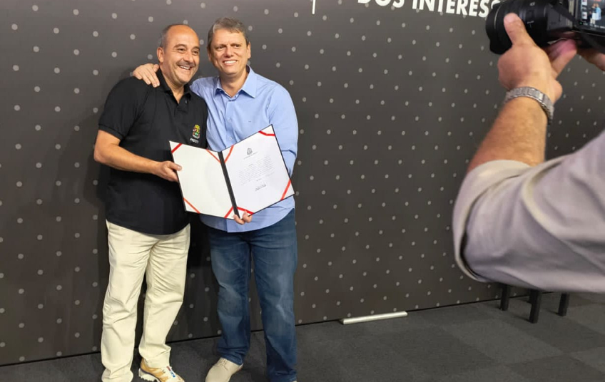 Ao lado do prefeito Guto Volpi, governador Tarcísio de Freitas assinou convênio para repasse ao projeto de R$ 1.5 milhão