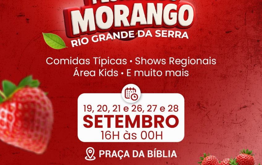 A cidade de Rio Grande da Serra vai ganhar um novo sabor em setembro! Vem aí o 1º Festival do Morango, um evento inédito que promete encantar moradores e visitantes com uma programação especial para toda a família.