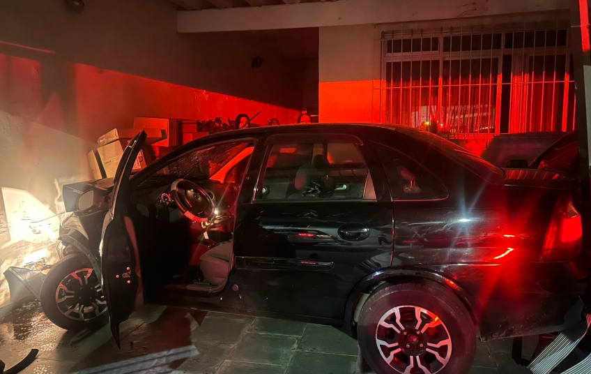 Prontamente prosseguiu no patrulhamento com vistas ao automóvel, quando pela Avenida São José (redondão) visualizou referido veículo com 2 ocupantes em seu interior. Foi dado o sinal de parada ao condutor que não foi obedecido, sendo iniciado um breve acompanhamento, quando pela Rua Angra dos Reis, o evasor perdeu o controle da direção veicular vindo a colidir com o portão de uma residência.