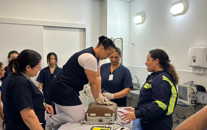 Participaram da condução da capacitação as enfermeiras Taciane Freitas, responsável pela Educação Continuada em Enfermagem, e Daniela de Souza, do Núcleo de Emergência e Urgência, além do técnico de enfermagem Victor Vitória e da coordenadora de Enfermagem, Maria Silmara Rosenblat.