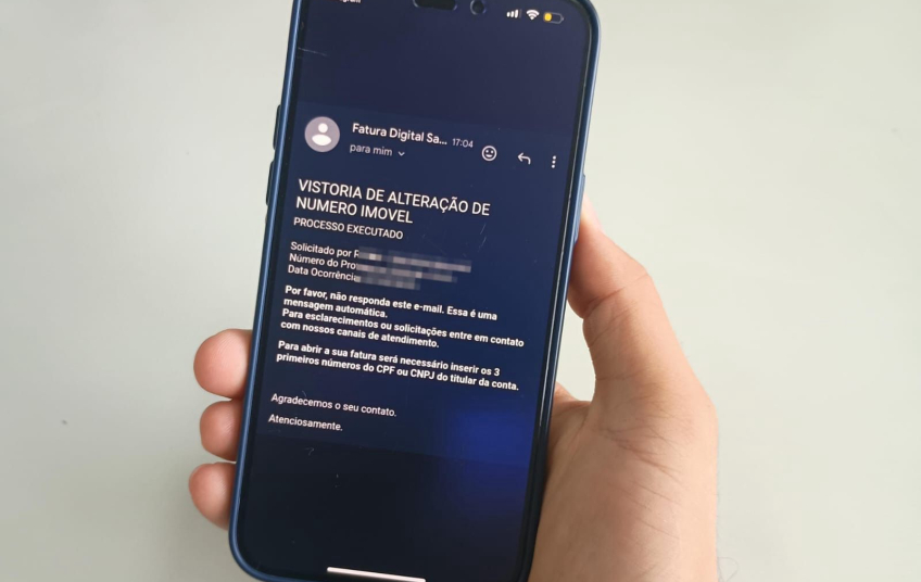 Um dos e-mails encaminhados cita uma suposta alteração na numeração da residência. Nele constam dados dos munícipes, números de protocolo e datas de solicitação fictícios. Em anexo há um falso boleto para pagamento onde só assim seria possível regularizar a situação.