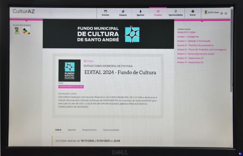 Santo André, 21 de novembro de 2024 – A Prefeitura de Santo André, por meio da Secretaria de Cultura, abriu edital para seleção de propostas culturais a serem fomentadas com recursos do Fundo Municipal de Cultura. O orçamento total é de R$ 1.050 milhão, o maior já disponibilizado em uma única convocatória desde a criação do mecanismo de financiamento há 34 anos. Os interessados têm até 31 de janeiro de 2025 para submeter seus projetos exclusivamente via plataforma CulturAZ: https://bit.ly/EditalFundoCulturaSA2024.