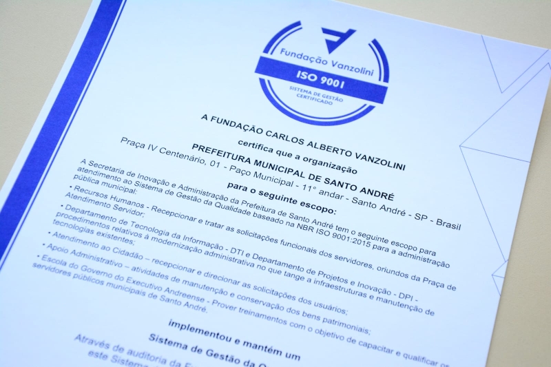 Santo André, 27 de novembro de 2024 – A Secretaria de Inovação e Administração (SIA) da Prefeitura de Santo André alcançou um marco inédito ao conquistar a certificação ISO 9001:2015, reconhecida mundialmente por assegurar altos padrões de gestão da qualidade. Este processo de certificação, auditado pela Fundação Vanzolini entre os dias 23 e 25 de outubro, coloca a administração municipal em posição de destaque entre órgãos públicos ao demonstrar excelência no atendimento, eficiência operacional e aprimoramento contínuo dos serviços prestados à população.