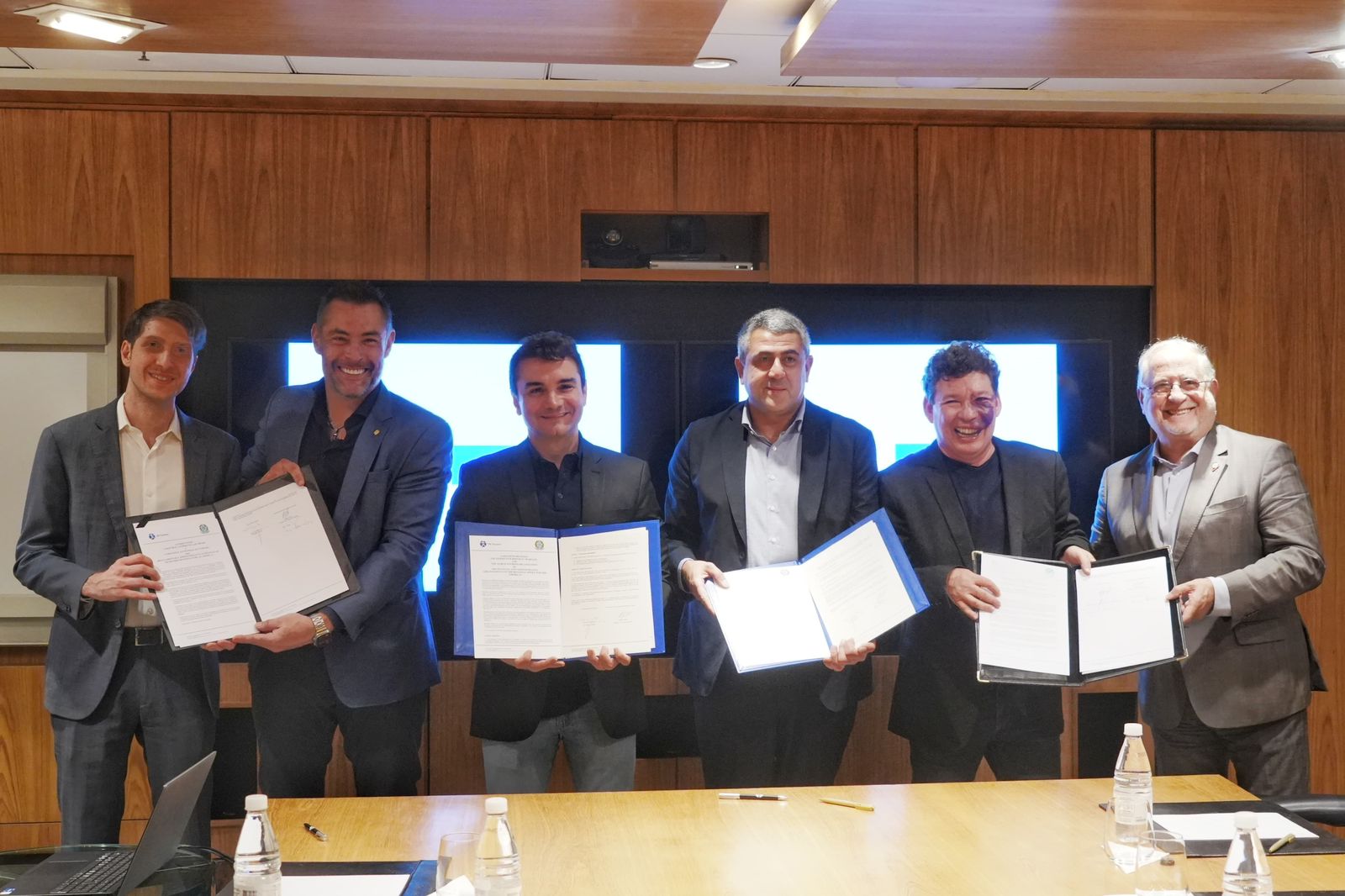 Secretário Geral da ONU Turismo, Zurab Pololikashvili, Ministro do Turismo do Brasil, Celso Sabino e o deputado federal Marangoni assinam acordo que cria o escritório regional da ONU Turismo para as Américas