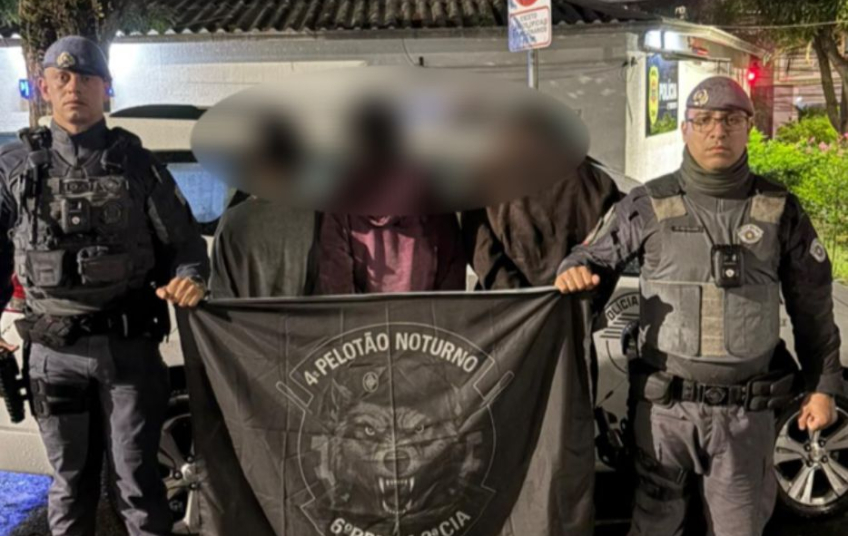 Equipe acionada via COPOM para atendimento de ocorrência de furto a estabelecimento comercial. Durante o deslocamento para o endereço informado, de posse das características dos suspeitos, a equipe visualizou e abordou três transeuntes na Avenida Lauro Gomes, n.º 1300, os quais portavam objetos de origem duvidosa.