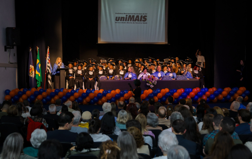 O Teatro Santos Dumont foi cenário, nesta quinta-feira (26/6), de uma cerimônia emocionante que celebrou a formatura de 65 alunos da UniMais (Universidade Aberta da Terceira Idade), programa da Prefeitura de São Caetano do Sul voltado à inclusão, valorização e formação continuada da população com mais de 50 anos. O evento marcou o encerramento de mais um ciclo de aprendizado, integração e troca de experiências entre os idosos participantes.
